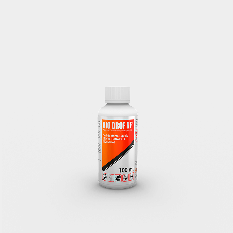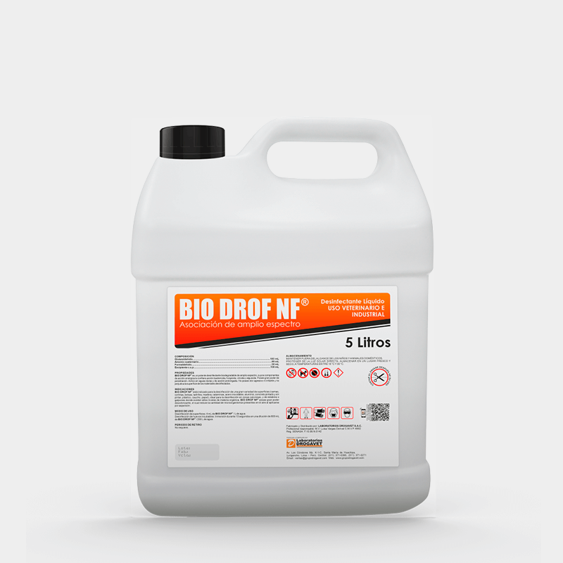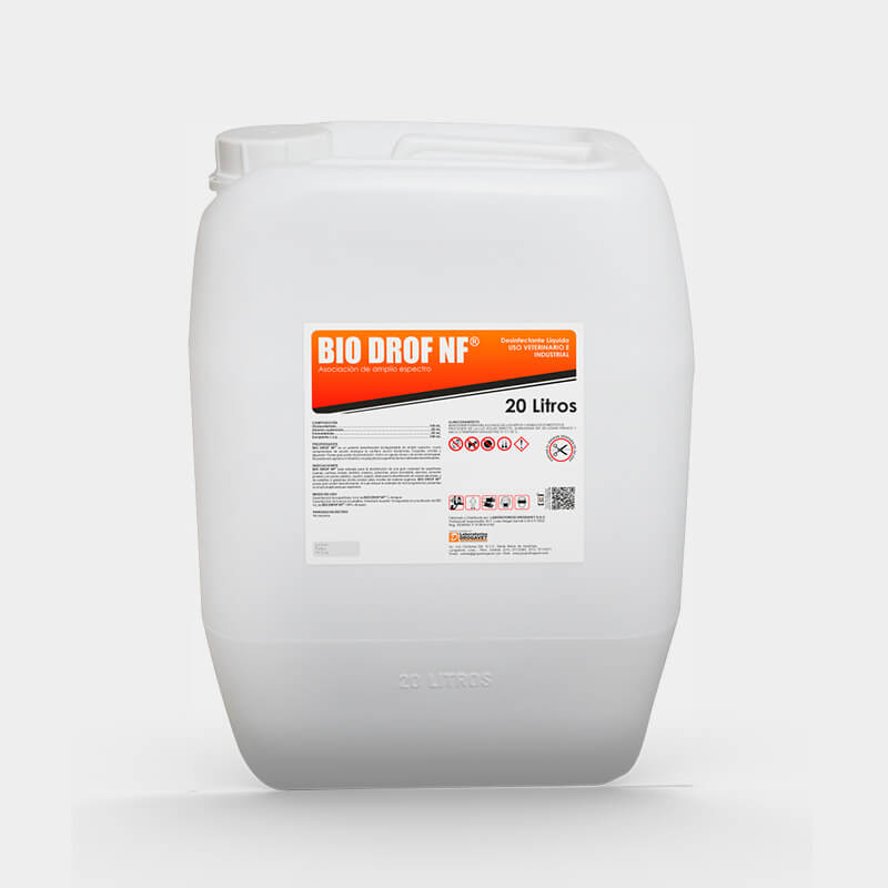 BIO DROF NF es un potente desinfectante biodegradable de amplio espectro, cuyos componentes de acción sinérgica le confiere acción bactericida, fungicida, viricida y alguicida. Posee gran poder de penetración. Activo en aguas duras y de acción prolongada. No posee olor agresivo ni irritante y no perjudica la superficie de los materiales desinfectados.
