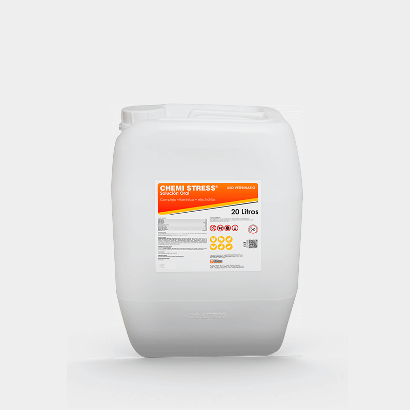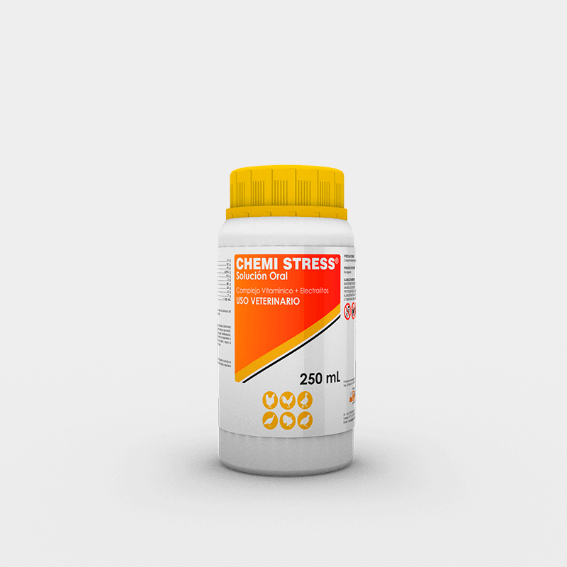 CHEMI STRESS Solución oral está indicado en aves (pollos, gallinas, pavos, patos y codornices) como terapia de soporte en cuadros de estrés (exceso de calor, transporte, manejo, vacunación, cambio de alimento). Intoxicaciones alimenticias y medicamentosas, hígado graso, deshidratación, retardo del crecimiento, dermatitis y emplume deficiente. Como coadyuvante en el tratamiento o convalecencia de enfermedades infecciosas y/o parasitarias. Estimula el apetito, mejora la conversión alimenticia, fertilidad, incubabilidad y aumenta la producción de huevo.