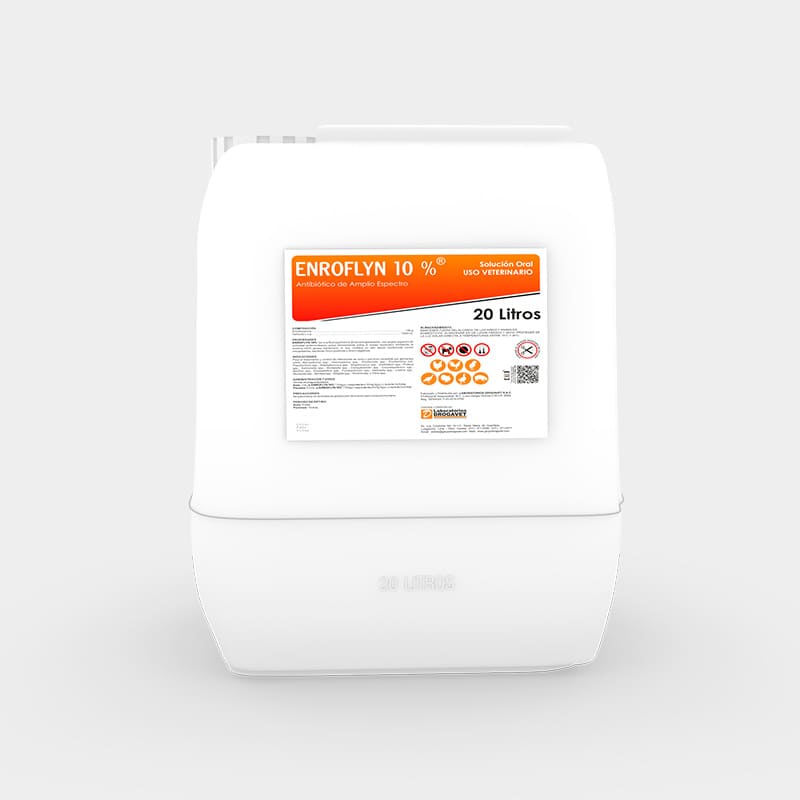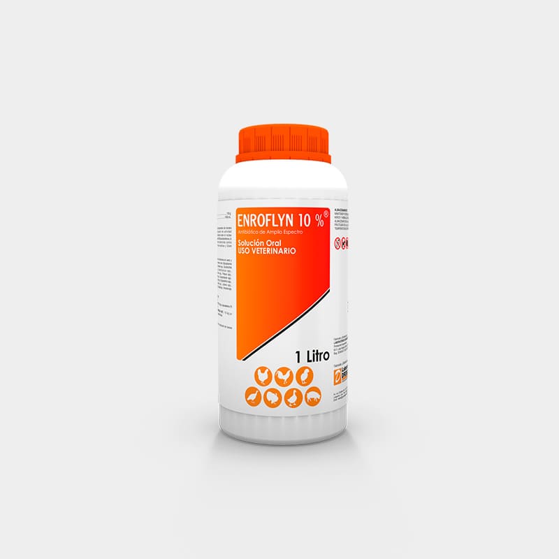 ENROFLYN 10% , indicado en porcicultura y avicultura (pollos de engorde, pollitos, pollonas y pavos) para el tratamiento y control de infecciones causadas por gérmenes como Mycoplasma spp., Haemophilus spp., Pasteurella spp., Escherichia coli, Pseudomona spp., Staphylococcus spp., Streptococcus spp., Clostridium spp., Proteus spp., Salmonella spp., Bordetella spp., Campylobacter spp., Corynebacterium spp., Bacillus spp., Erysipelothrix spp., Fusobacterium spp., Klebsiella spp., Listeria spp., Moraxella spp., Serratia spp., Shigella spp., Yersinia spp. y Vibrio spp.