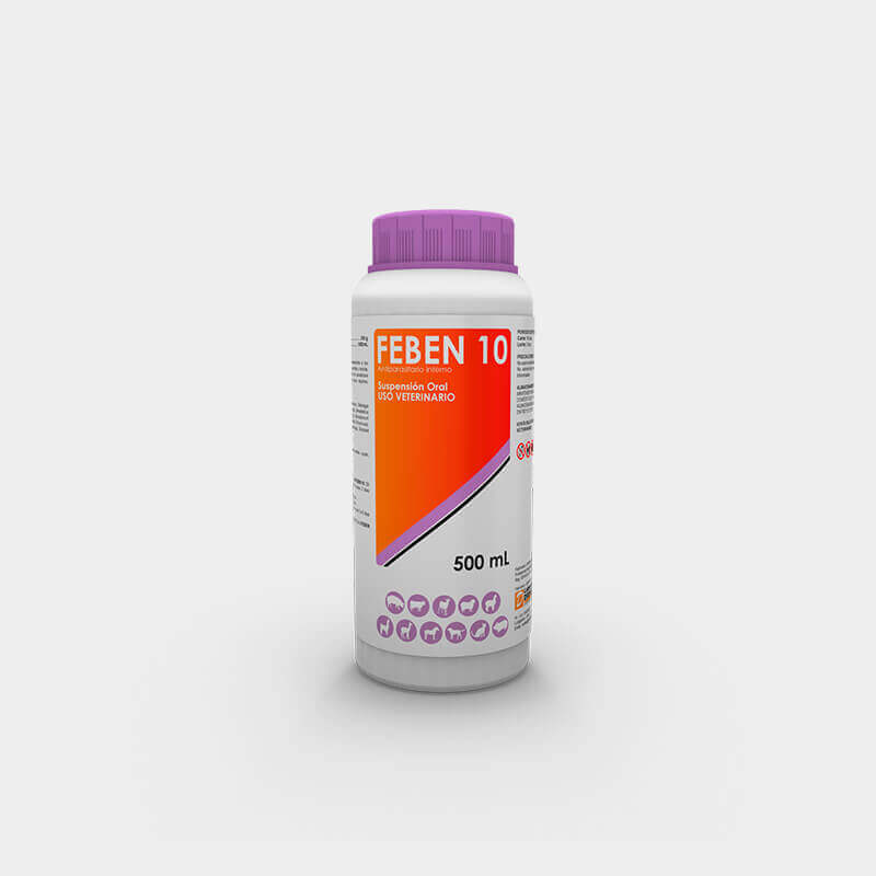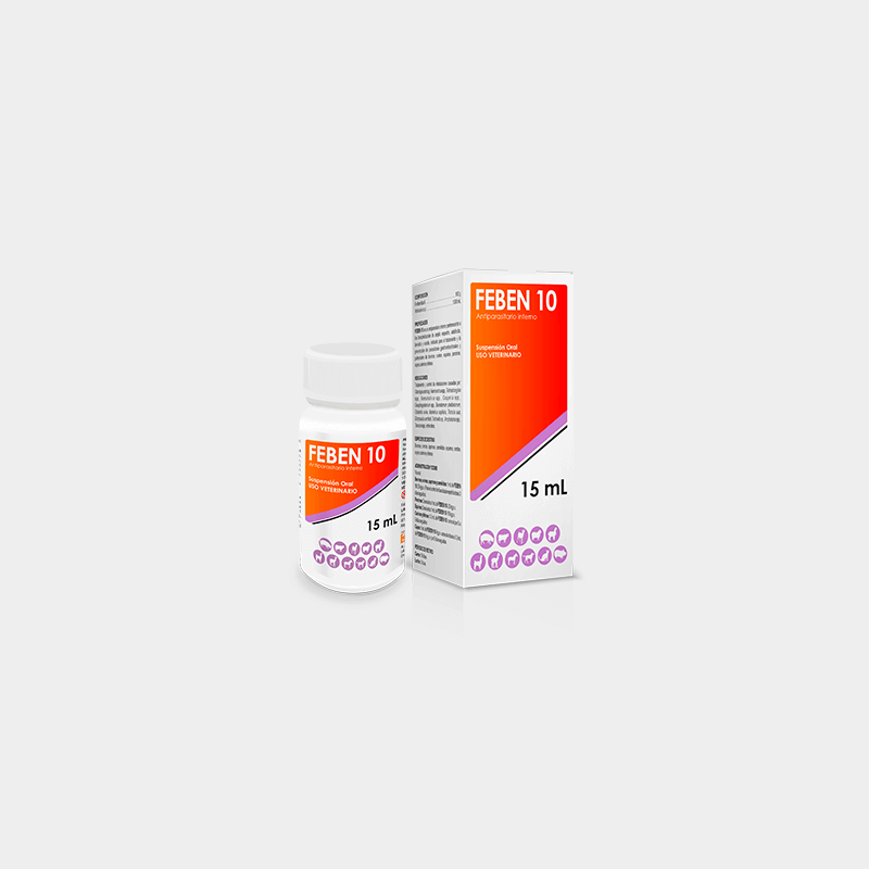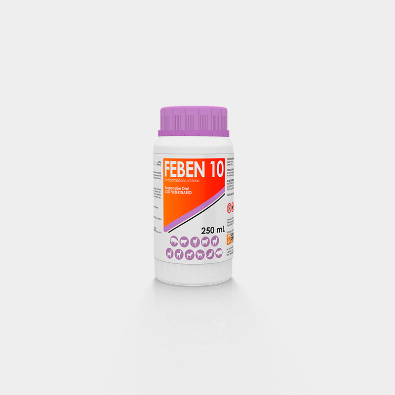 FEBEN 10 es un antiparasitario interno perteneciente a los benzimidazoles de amplio espectro, adulticida, larvicida y ovicida, indicado para el tratamiento y la prevención de parasitosis gastrointestinales y pulmonares de aves, bovinos, ovinos, equinos, porcinos, cuyes, caninos y felinos.