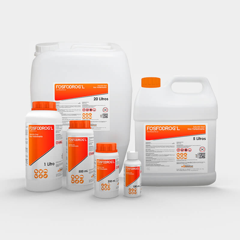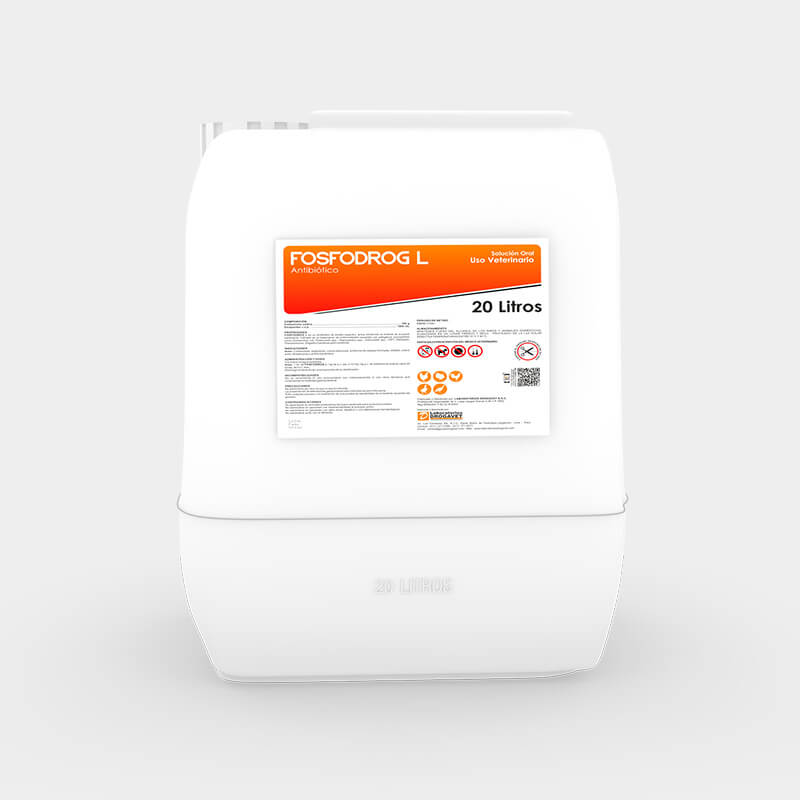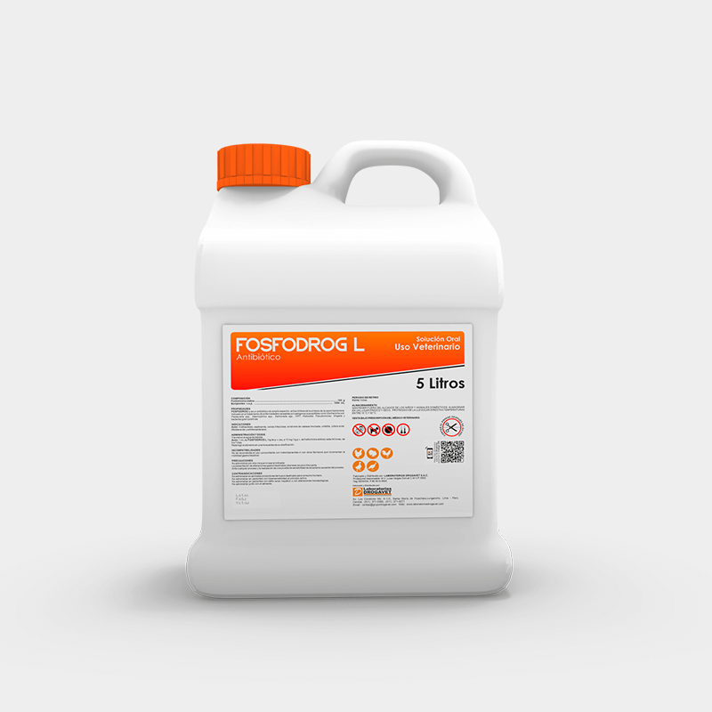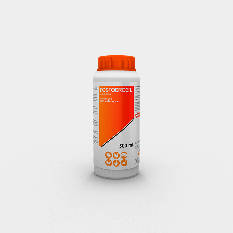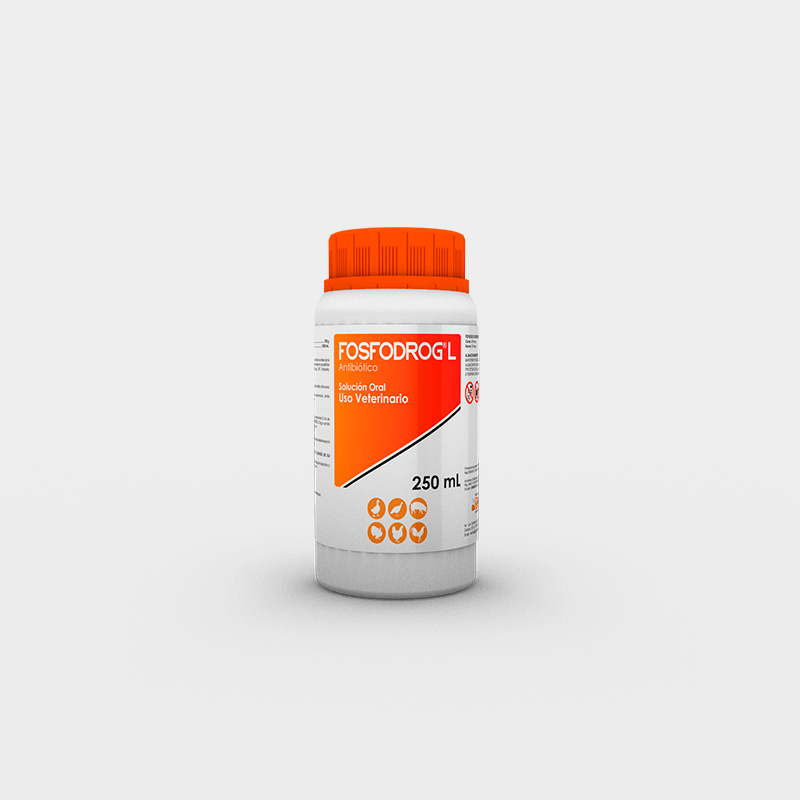 FOSFODROG L is a broad-spectrum bactericidal antibiotic, belonging to the family of phosphonic acid derivatives that acts by inhibiting the synthesis of the bacterial wall. Indicated in the treatment of diseases caused by susceptible pathogens such as Escherichia coli, Pasteurella spp., Haemophilus spp., Salmonella spp., ORT, Klebsiella, Pseudomonas, Shigella and Gram positive bacteria.