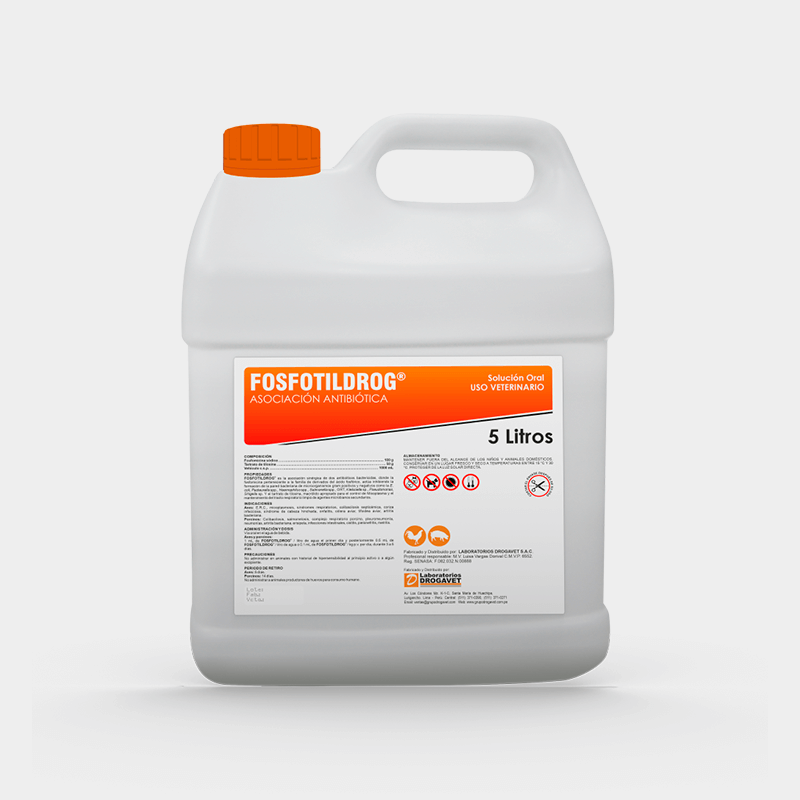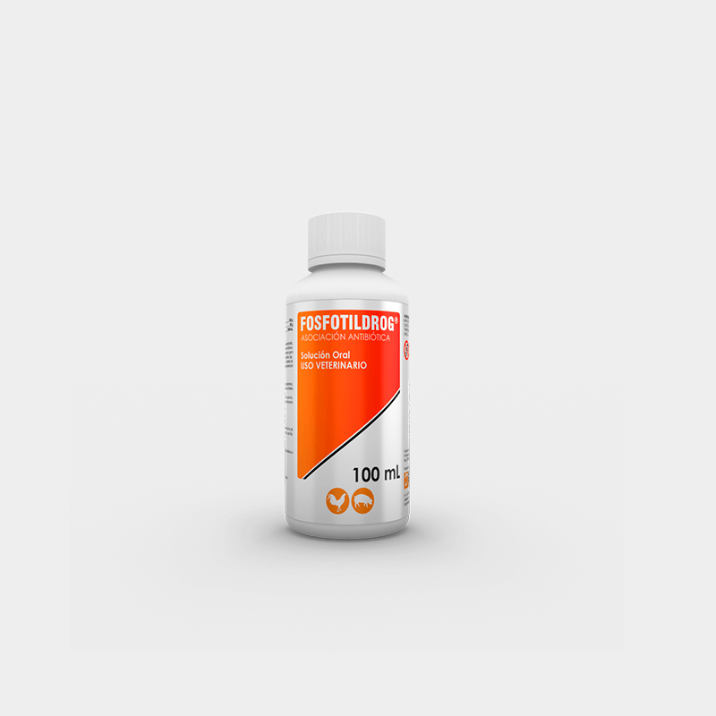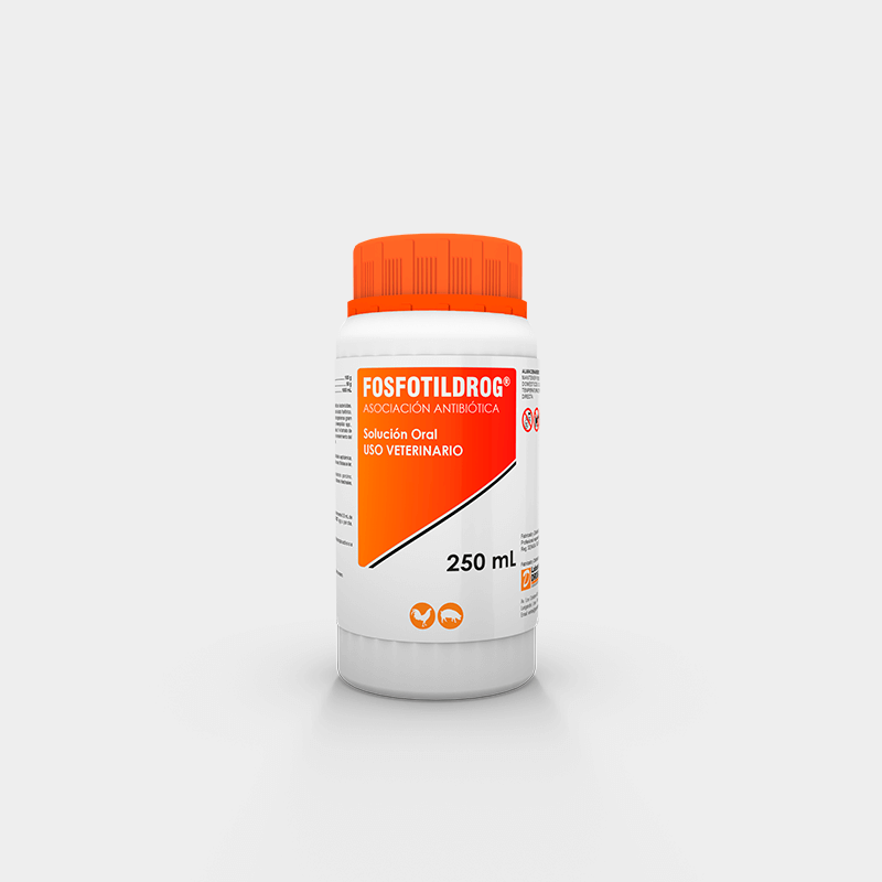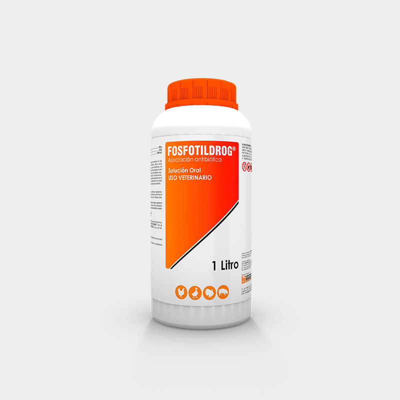 FOSFOTILDROG es la asociación sinérgica de dos antibióticos bactericidas, donde la fosfomicina perteneciente a la familia de derivados del ácido fosfórico, actúa inhibiendo la formación de la pared bacteriana de microorganismos gram positivos y negativos como la E. coli, Pasteurella spp., Haemophilus spp., Salmonella spp., ORT, Klebsiella sp., Pseudomonas, Shigella sp. Y el tartrato de tilosina, macrólido apropiado para el control de Micoplasma y el mantenimiento del tracto respiratorio limpio de agentes microbianos secundarios.