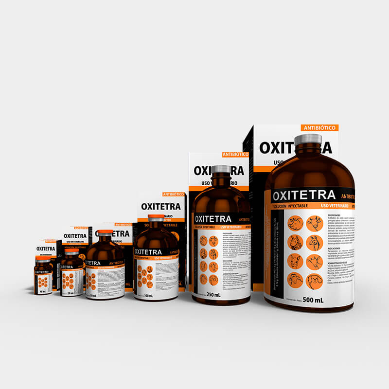 OXITETRA antibiótico de amplio espectro compuesto por cuatro principios activos: oxitetraciclina sintética bacteriostática de amplio espectro actúa contra bacterias (micoplasma, rickettsia) y algunos protozoos; el florfenicol, antibiótico análogo del tianfenicol el cuál es un derivado del cloranfenicol, posee la misma actividad antibacteriana de éste sin producir anemia aplásica. La dexametasona, glucocorticoide sintético fluorado, de rápida absorción con propiedades antinflamatorias, antialérgicas e inmunosupresoras. La lidocaína, anestésico local que disminuye el dolor al momento de la inyección.