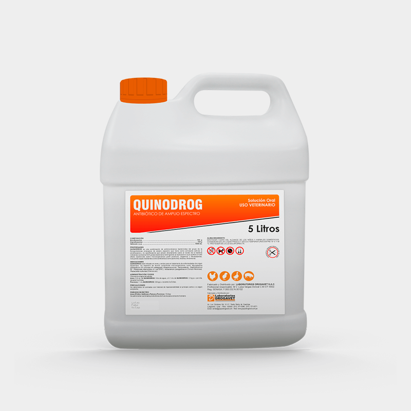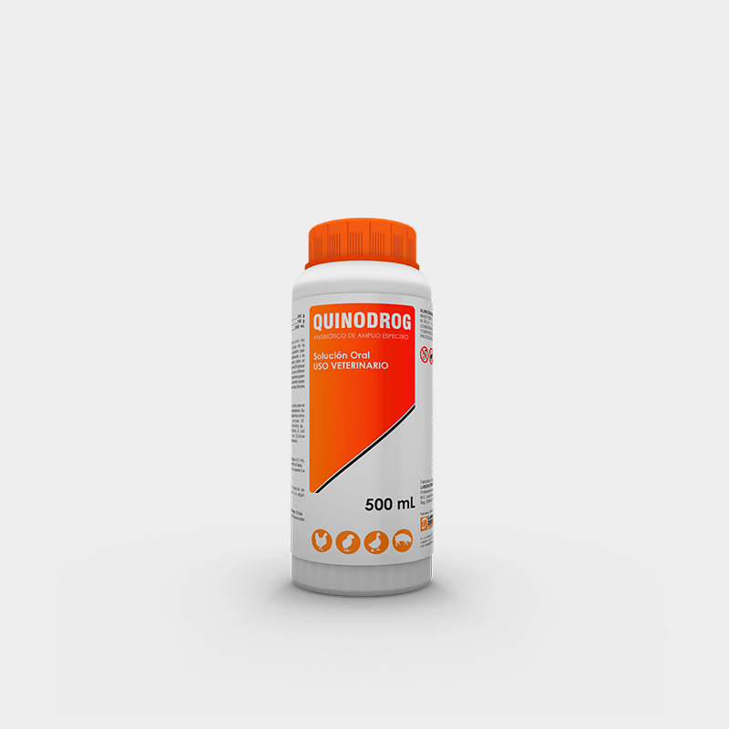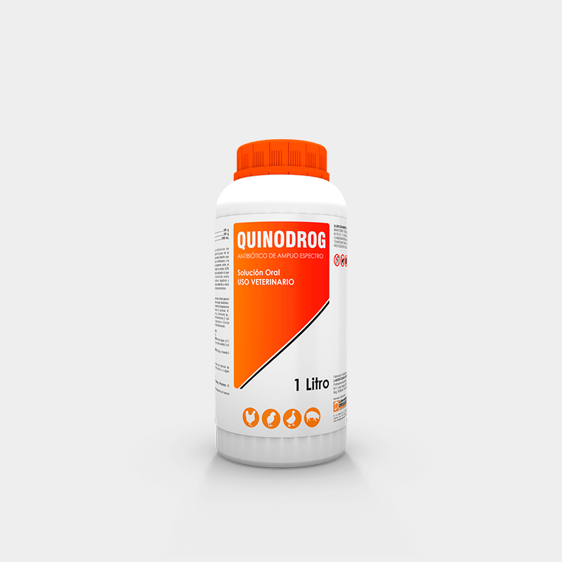QUINODROG is indicated in poultry and pigs for the treatment of diseases of bacterial origin. Its spectrum of action includes microorganisms such as Mycoplasma gallisepticum, M. synoviae, M. meleagridis, Streptococcus sp., Salmonella sp., Staphylococcus sp., Pasteurella haemolytica, E. coli (RCS), Avibacterium paragallinarum (infectious coryza), Pasteurella multocida (Avian cholera).